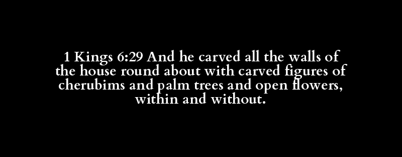1 Kings 6:29 And he carved all the walls of the house round about with carved figures of cherubims and palm trees and open flowers, within and without.