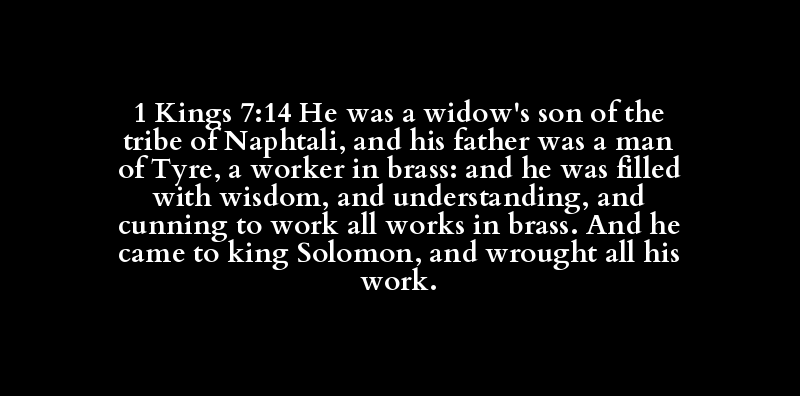 1 Kings 7:14 He was a widow's son of the tribe of Naphtali, and his father was a man of Tyre, a worker in brass: and he was filled with wisdom, and understanding, and cunning to work all works in brass. And he came to king Solomon, and wrought all his work.