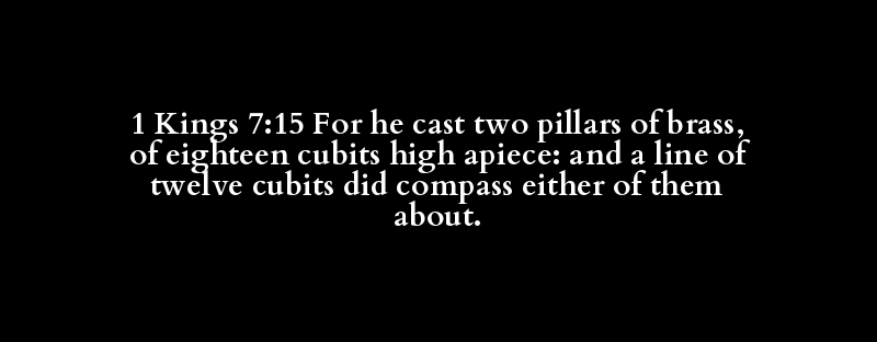 1 Kings 7:15 For he cast two pillars of brass, of eighteen cubits high apiece: and a line of twelve cubits did compass either of them about.