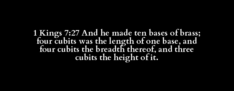1 Kings 7:27 And he made ten bases of brass; four cubits was the length of one base, and four cubits the breadth thereof, and three cubits the height of it.