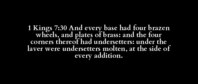 1 Kings 7:30 And every base had four brazen wheels, and plates of brass: and the four corners thereof had undersetters: under the laver were undersetters molten, at the side of every addition.