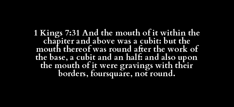 1 Kings 7:31 And the mouth of it within the chapiter and above was a cubit: but the mouth thereof was round after the work of the base, a cubit and an half: and also upon the mouth of it were gravings with their borders, foursquare, not round.