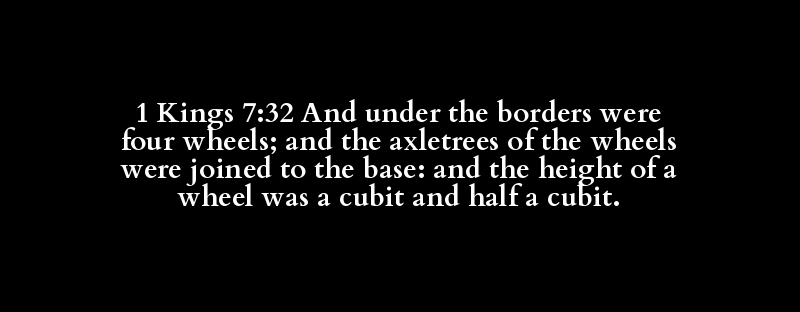 1 Kings 7:32 And under the borders were four wheels; and the axletrees of the wheels were joined to the base: and the height of a wheel was a cubit and half a cubit.