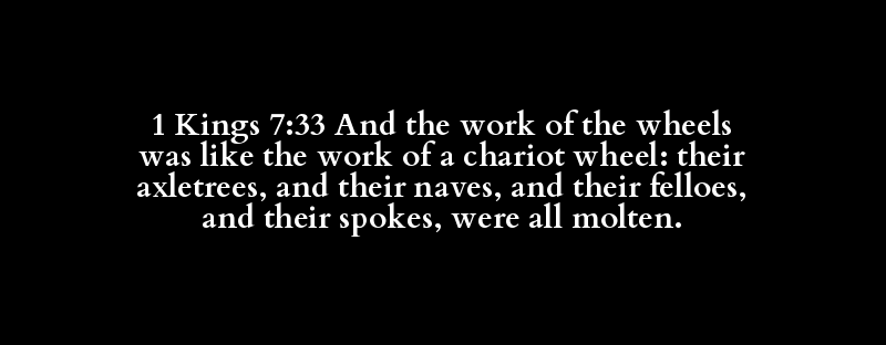 1 Kings 7:33 And the work of the wheels was like the work of a chariot wheel: their axletrees, and their naves, and their felloes, and their spokes, were all molten.