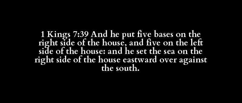 1 Kings 7:39 And he put five bases on the right side of the house, and five on the left side of the house: and he set the sea on the right side of the house eastward over against the south.