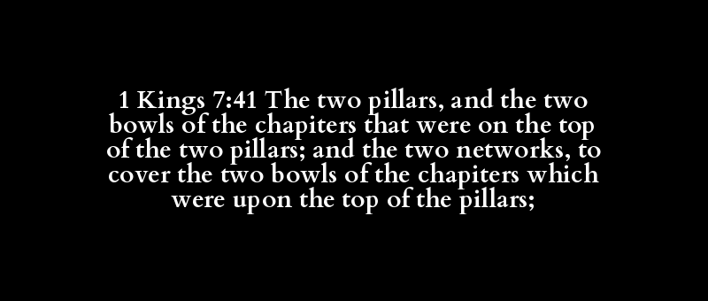 1 Kings 7:41 The two pillars, and the two bowls of the chapiters that were on the top of the two pillars; and the two networks, to cover the two bowls of the chapiters which were upon the top of the pillars;