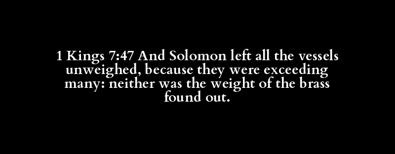 1 Kings 7:47 And Solomon left all the vessels unweighed, because they were exceeding many: neither was the weight of the brass found out.