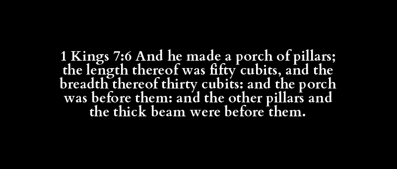 1 Kings 7:6 And he made a porch of pillars; the length thereof was fifty cubits, and the breadth thereof thirty cubits: and the porch was before them: and the other pillars and the thick beam were before them.