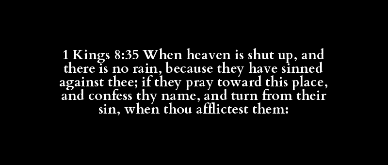 1 Kings 8:35 When heaven is shut up, and there is no rain, because they have sinned against thee; if they pray toward this place, and confess thy name, and turn from their sin, when thou afflictest them: