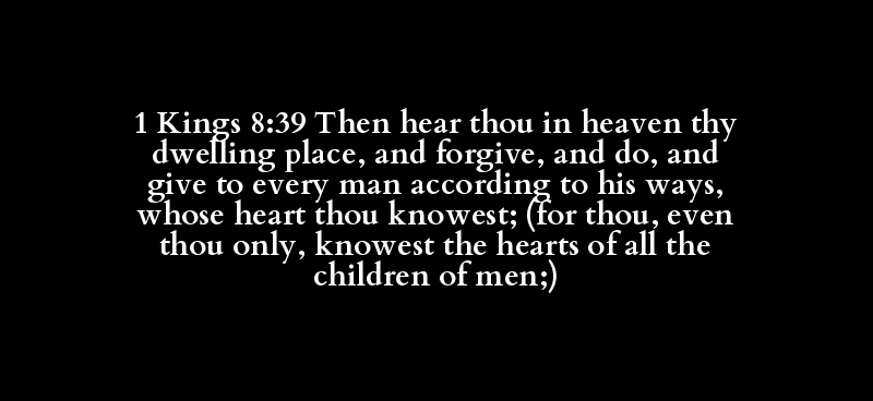 1 Kings 8:39 Then hear thou in heaven thy dwelling place, and forgive, and do, and give to every man according to his ways, whose heart thou knowest; (for thou, even thou only, knowest the hearts of all the children of men;)