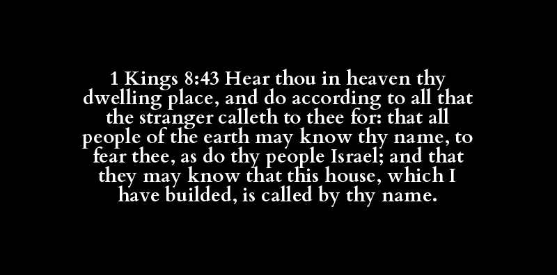 1 Kings 8:43 Hear thou in heaven thy dwelling place, and do according to all that the stranger calleth to thee for: that all people of the earth may know thy name, to fear thee, as do thy people Israel; and that they may know that this house, which I have builded, is called by thy name.