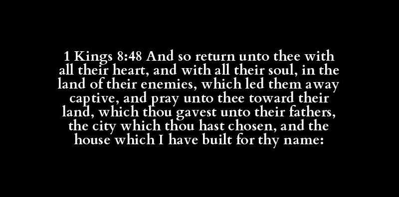 1 Kings 8:48 And so return unto thee with all their heart, and with all their soul, in the land of their enemies, which led them away captive, and pray unto thee toward their land, which thou gavest unto their fathers, the city which thou hast chosen, and the house which I have built for thy name: