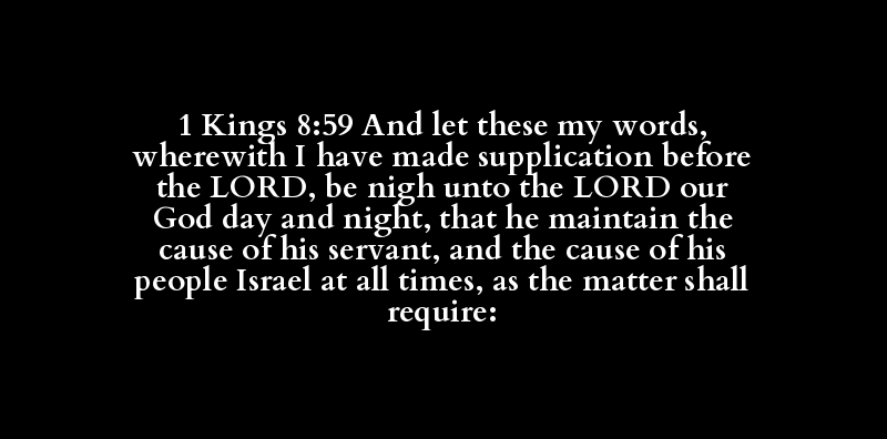 1 Kings 8:59 And let these my words, wherewith I have made supplication before the LORD, be nigh unto the LORD our God day and night, that he maintain the cause of his servant, and the cause of his people Israel at all times, as the matter shall require:
