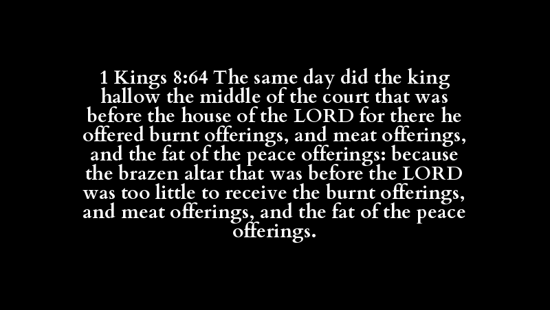 1 Kings 8:64 The same day did the king hallow the middle of the court that was before the house of the LORD for there he offered burnt offerings, and meat offerings, and the fat of the peace offerings: because the brazen altar that was before the LORD was too little to receive the burnt offerings, and meat offerings, and the fat of the peace offerings.
