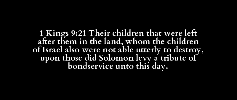 1 Kings 9:21 Their children that were left after them in the land, whom the children of Israel also were not able utterly to destroy, upon those did Solomon levy a tribute of bondservice unto this day.