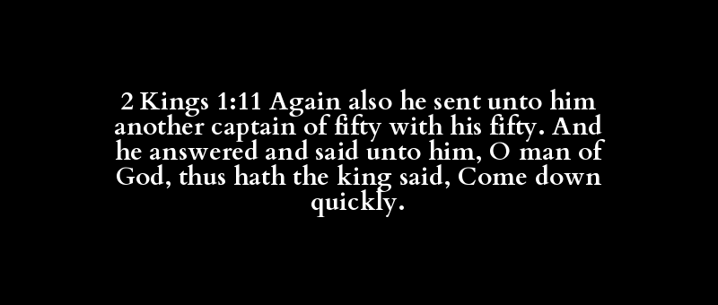 2 Kings 1:11 Again also he sent unto him another captain of fifty with his fifty. And he answered and said unto him, O man of God, thus hath the king said, Come down quickly.
