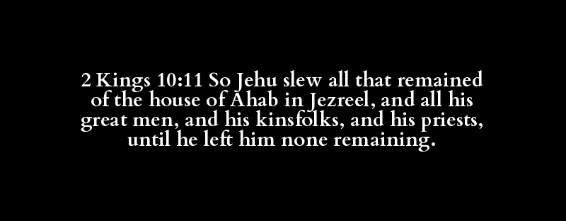 2 Kings 10:11 So Jehu slew all that remained of the house of Ahab in Jezreel, and all his great men, and his kinsfolks, and his priests, until he left him none remaining.