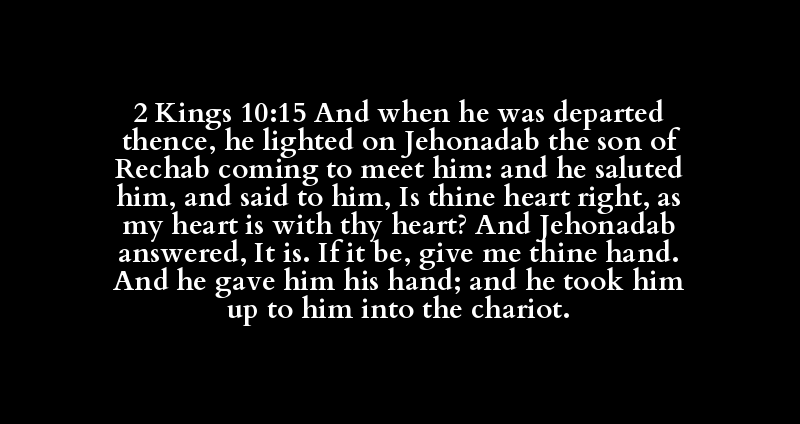 2 Kings 10:15 And when he was departed thence, he lighted on Jehonadab the son of Rechab coming to meet him: and he saluted him, and said to him, Is thine heart right, as my heart is with thy heart? And Jehonadab answered, It is. If it be, give me thine hand. And he gave him his hand; and he took him up to him into the chariot.