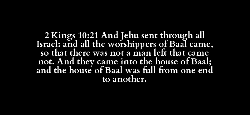 2 Kings 10:21 And Jehu sent through all Israel: and all the worshippers of Baal came, so that there was not a man left that came not. And they came into the house of Baal; and the house of Baal was full from one end to another.