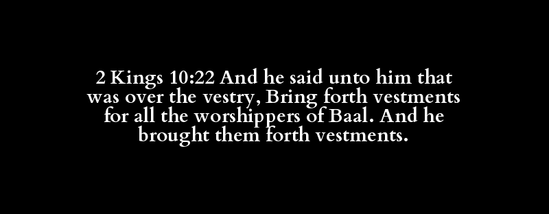 2 Kings 10:22 And he said unto him that was over the vestry, Bring forth vestments for all the worshippers of Baal. And he brought them forth vestments.