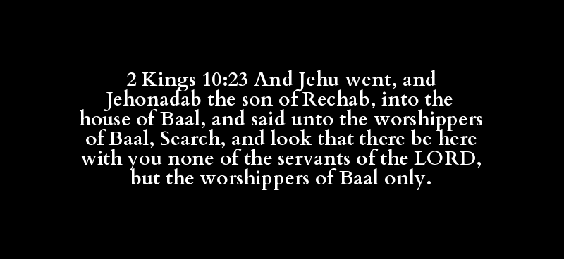 2 Kings 10:23 And Jehu went, and Jehonadab the son of Rechab, into the house of Baal, and said unto the worshippers of Baal, Search, and look that there be here with you none of the servants of the LORD, but the worshippers of Baal only.