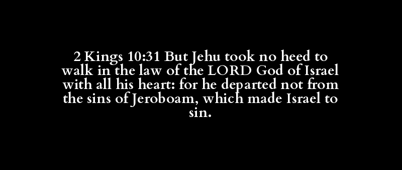 2 Kings 10:31 But Jehu took no heed to walk in the law of the LORD God of Israel with all his heart: for he departed not from the sins of Jeroboam, which made Israel to sin.