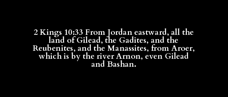2 Kings 10:33 From Jordan eastward, all the land of Gilead, the Gadites, and the Reubenites, and the Manassites, from Aroer, which is by the river Arnon, even Gilead and Bashan.