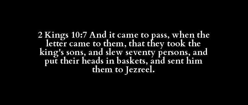 2 Kings 10:7 And it came to pass, when the letter came to them, that they took the king's sons, and slew seventy persons, and put their heads in baskets, and sent him them to Jezreel.