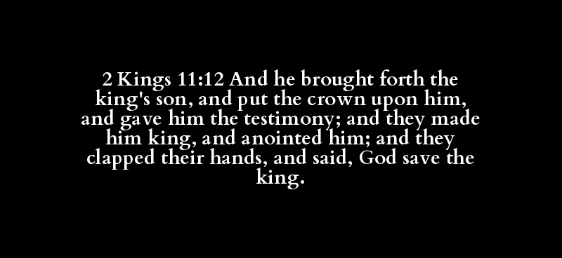 2 Kings 11:12 And he brought forth the king's son, and put the crown upon him, and gave him the testimony; and they made him king, and anointed him; and they clapped their hands, and said, God save the king.