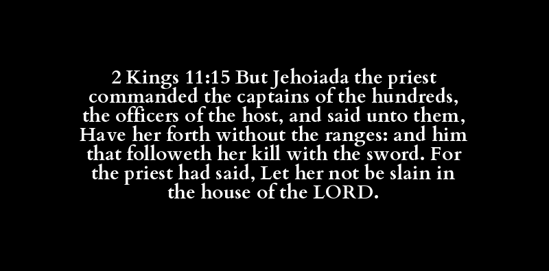 2 Kings 11:15 But Jehoiada the priest commanded the captains of the hundreds, the officers of the host, and said unto them, Have her forth without the ranges: and him that followeth her kill with the sword. For the priest had said, Let her not be slain in the house of the LORD.