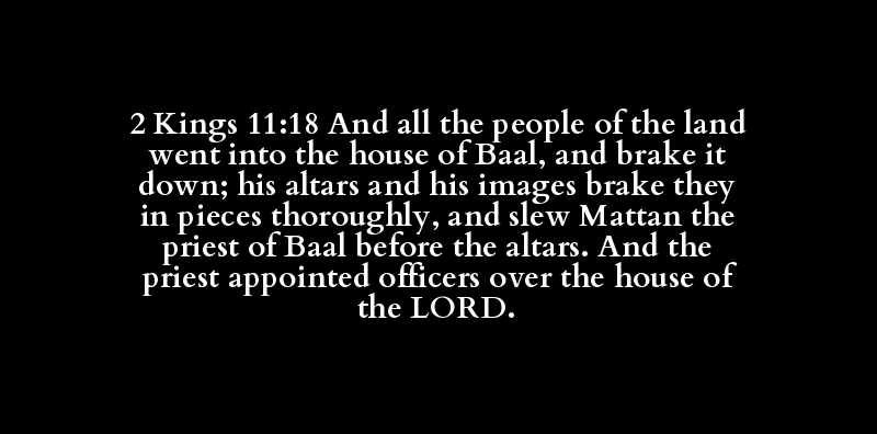 2 Kings 11:18 And all the people of the land went into the house of Baal, and brake it down; his altars and his images brake they in pieces thoroughly, and slew Mattan the priest of Baal before the altars. And the priest appointed officers over the house of the LORD.