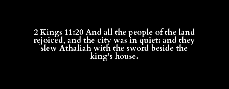 2 Kings 11:20 And all the people of the land rejoiced, and the city was in quiet: and they slew Athaliah with the sword beside the king's house.