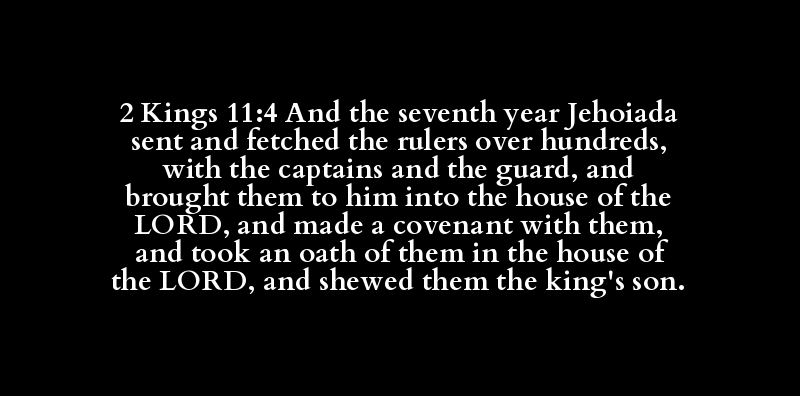 2 Kings 11:4 And the seventh year Jehoiada sent and fetched the rulers over hundreds, with the captains and the guard, and brought them to him into the house of the LORD, and made a covenant with them, and took an oath of them in the house of the LORD, and shewed them the king's son.