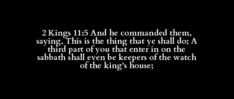 2 Kings 11:5 And he commanded them, saying, This is the thing that ye shall do; A third part of you that enter in on the sabbath shall even be keepers of the watch of the king's house;