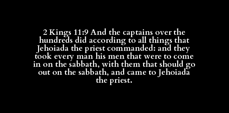 2 Kings 11:9 And the captains over the hundreds did according to all things that Jehoiada the priest commanded: and they took every man his men that were to come in on the sabbath, with them that should go out on the sabbath, and came to Jehoiada the priest.