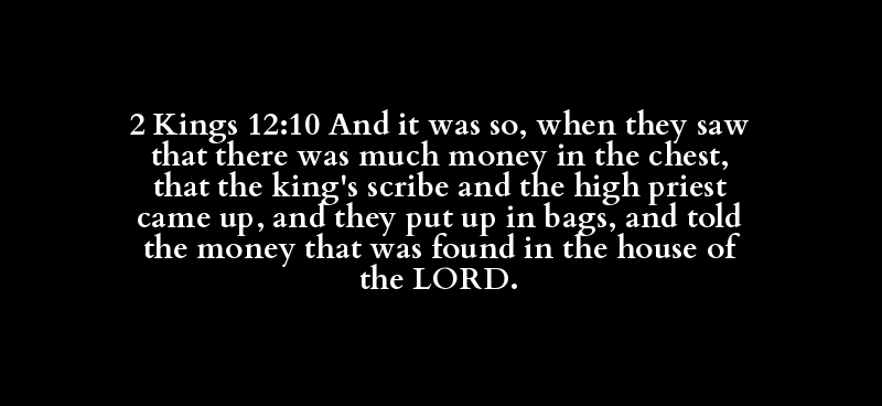 2 Kings 12:10 And it was so, when they saw that there was much money in the chest, that the king's scribe and the high priest came up, and they put up in bags, and told the money that was found in the house of the LORD.