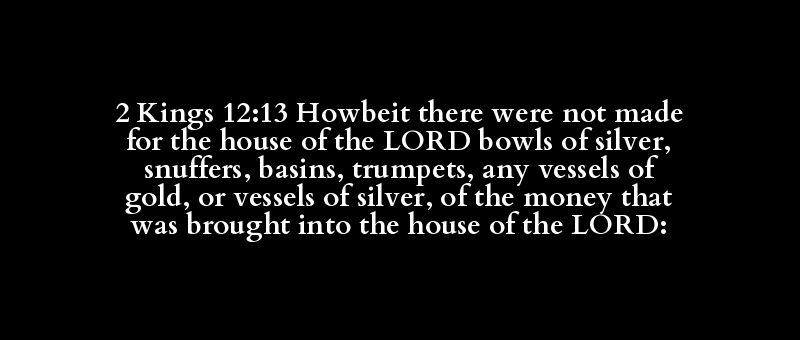 2 Kings 12:13 Howbeit there were not made for the house of the LORD bowls of silver, snuffers, basins, trumpets, any vessels of gold, or vessels of silver, of the money that was brought into the house of the LORD: