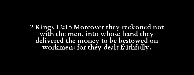 2 Kings 12:15 Moreover they reckoned not with the men, into whose hand they delivered the money to be bestowed on workmen: for they dealt faithfully.