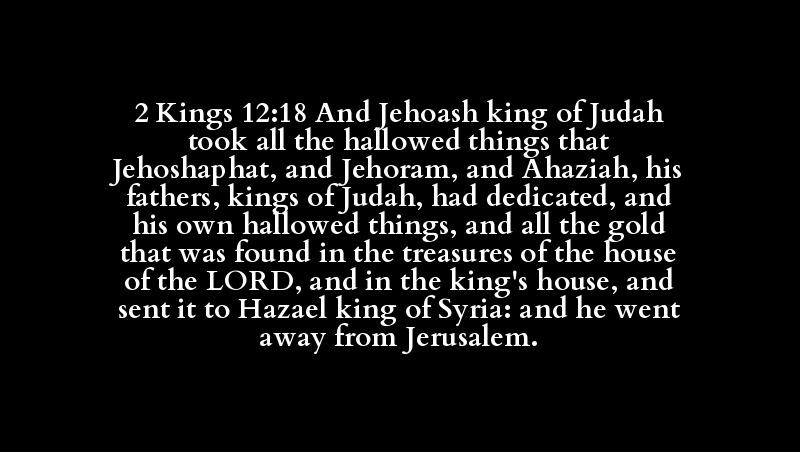 2 Kings 12:18 And Jehoash king of Judah took all the hallowed things that Jehoshaphat, and Jehoram, and Ahaziah, his fathers, kings of Judah, had dedicated, and his own hallowed things, and all the gold that was found in the treasures of the house of the LORD, and in the king's house, and sent it to Hazael king of Syria: and he went away from Jerusalem.