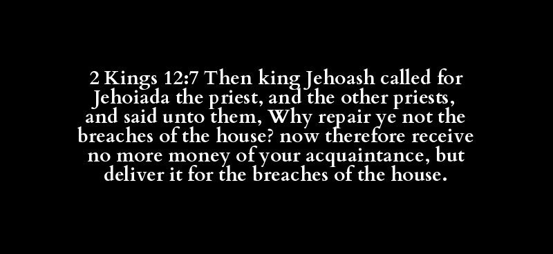 2 Kings 12:7 Then king Jehoash called for Jehoiada the priest, and the other priests, and said unto them, Why repair ye not the breaches of the house? now therefore receive no more money of your acquaintance, but deliver it for the breaches of the house.