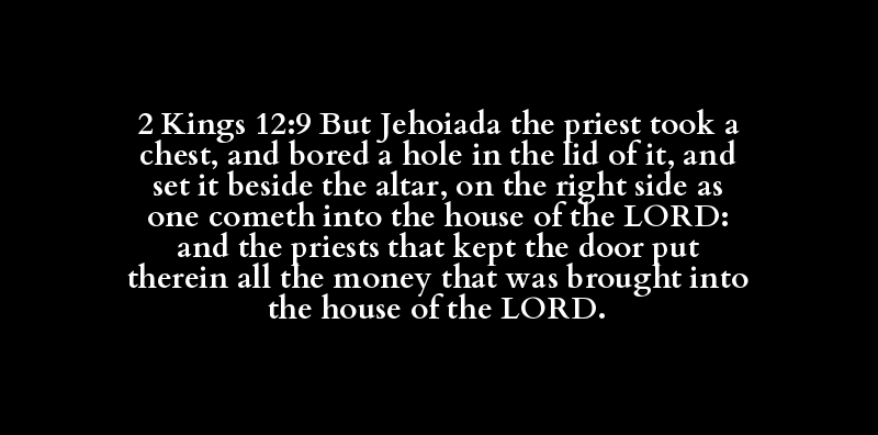 2 Kings 12:9 But Jehoiada the priest took a chest, and bored a hole in the lid of it, and set it beside the altar, on the right side as one cometh into the house of the LORD: and the priests that kept the door put therein all the money that was brought into the house of the LORD.