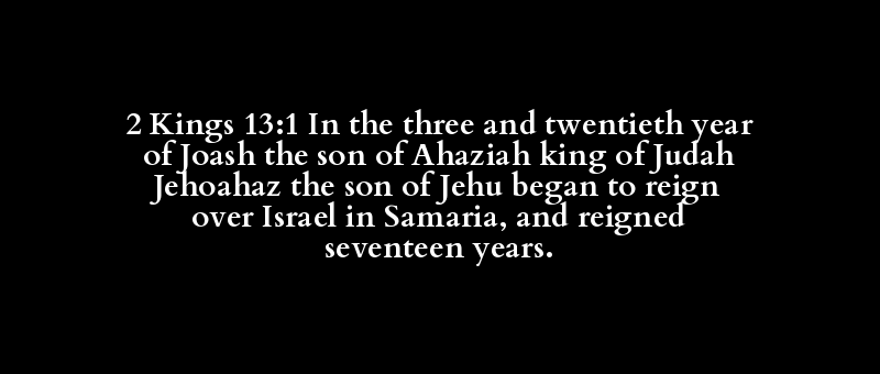 2 Kings 13:1 In the three and twentieth year of Joash the son of Ahaziah king of Judah Jehoahaz the son of Jehu began to reign over Israel in Samaria, and reigned seventeen years.