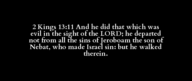 2 Kings 13:11 And he did that which was evil in the sight of the LORD; he departed not from all the sins of Jeroboam the son of Nebat, who made Israel sin: but he walked therein.