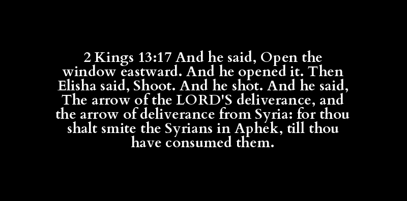 2 Kings 13:17 And he said, Open the window eastward. And he opened it. Then Elisha said, Shoot. And he shot. And he said, The arrow of the LORD'S deliverance, and the arrow of deliverance from Syria: for thou shalt smite the Syrians in Aphek, till thou have consumed them.