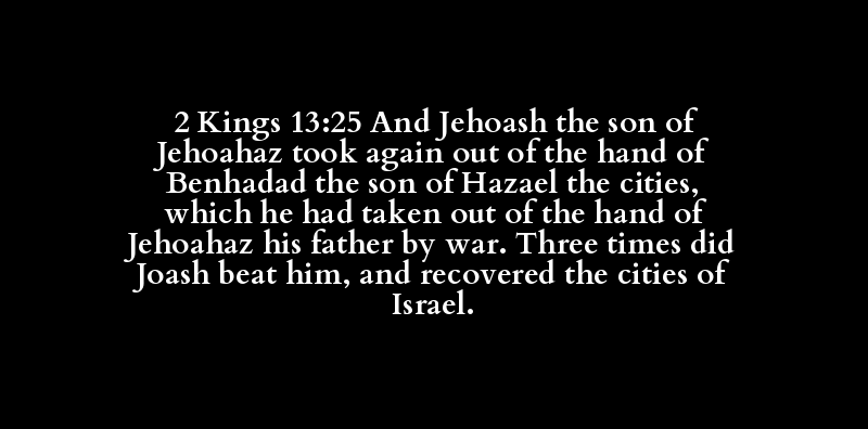 2 Kings 13:25 And Jehoash the son of Jehoahaz took again out of the hand of Benhadad the son of Hazael the cities, which he had taken out of the hand of Jehoahaz his father by war. Three times did Joash beat him, and recovered the cities of Israel.