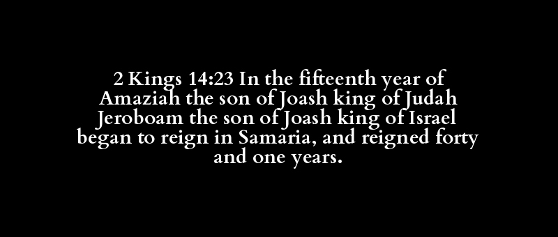 2 Kings 14:23 In the fifteenth year of Amaziah the son of Joash king of Judah Jeroboam the son of Joash king of Israel began to reign in Samaria, and reigned forty and one years.