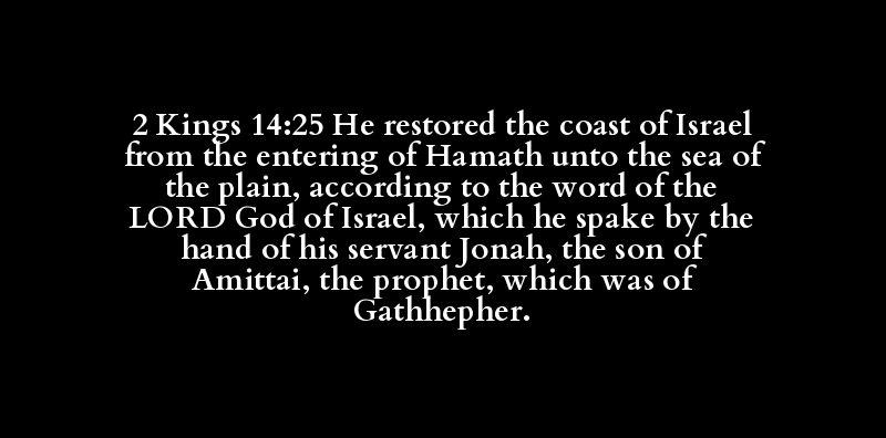 2 Kings 14:25 He restored the coast of Israel from the entering of Hamath unto the sea of the plain, according to the word of the LORD God of Israel, which he spake by the hand of his servant Jonah, the son of Amittai, the prophet, which was of Gathhepher.