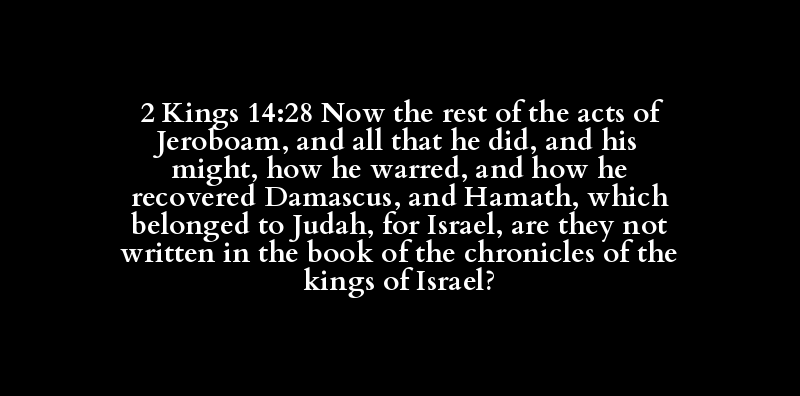 2 Kings 14:28 Now the rest of the acts of Jeroboam, and all that he did, and his might, how he warred, and how he recovered Damascus, and Hamath, which belonged to Judah, for Israel, are they not written in the book of the chronicles of the kings of Israel?