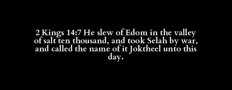 2 Kings 14:7 He slew of Edom in the valley of salt ten thousand, and took Selah by war, and called the name of it Joktheel unto this day.