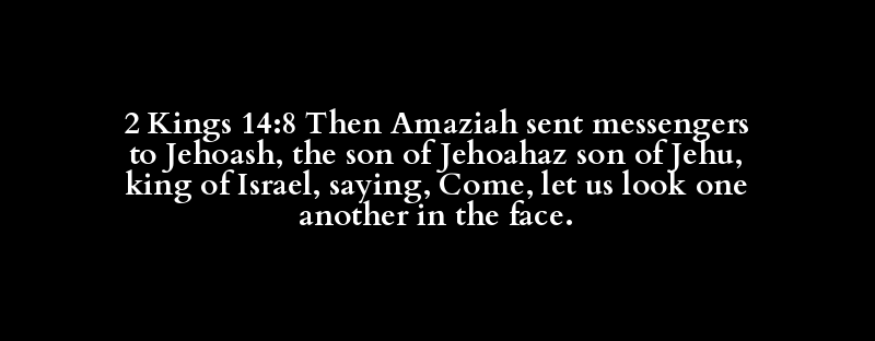 2 Kings 14:8 Then Amaziah sent messengers to Jehoash, the son of Jehoahaz son of Jehu, king of Israel, saying, Come, let us look one another in the face.